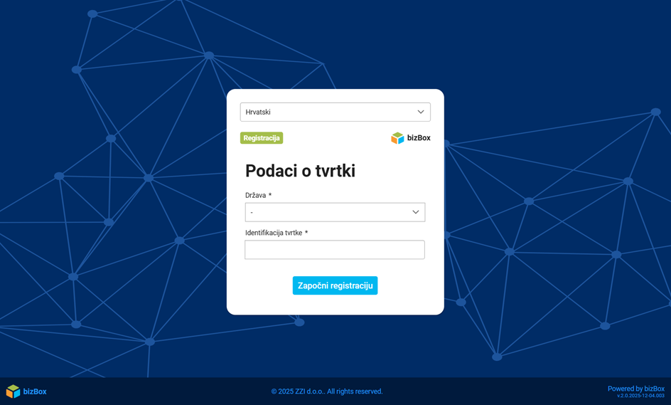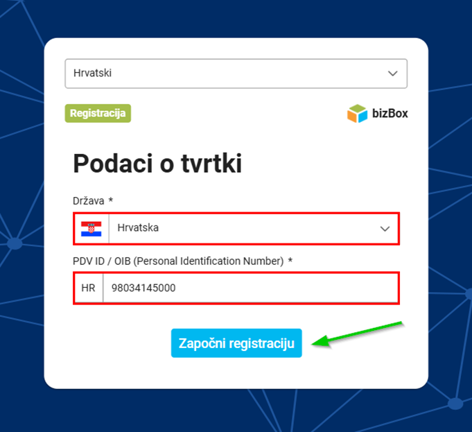 U padajućem izborniku odaberite Hrvatsku i unesite porezni broj tvrtke. Kada je unos ispravan, kliknite Započni registraciju.