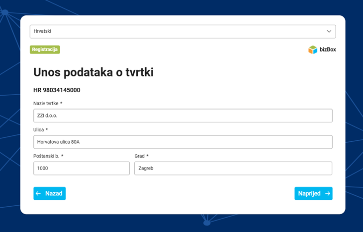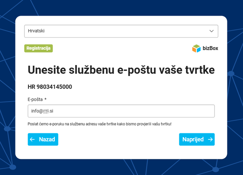 Prikazana je službena e-mail adresa tvrtke koju preuzimamo iz službenog državnog registra poduzeća. Provjerite e-mail adresu i kliknite Naprijed.