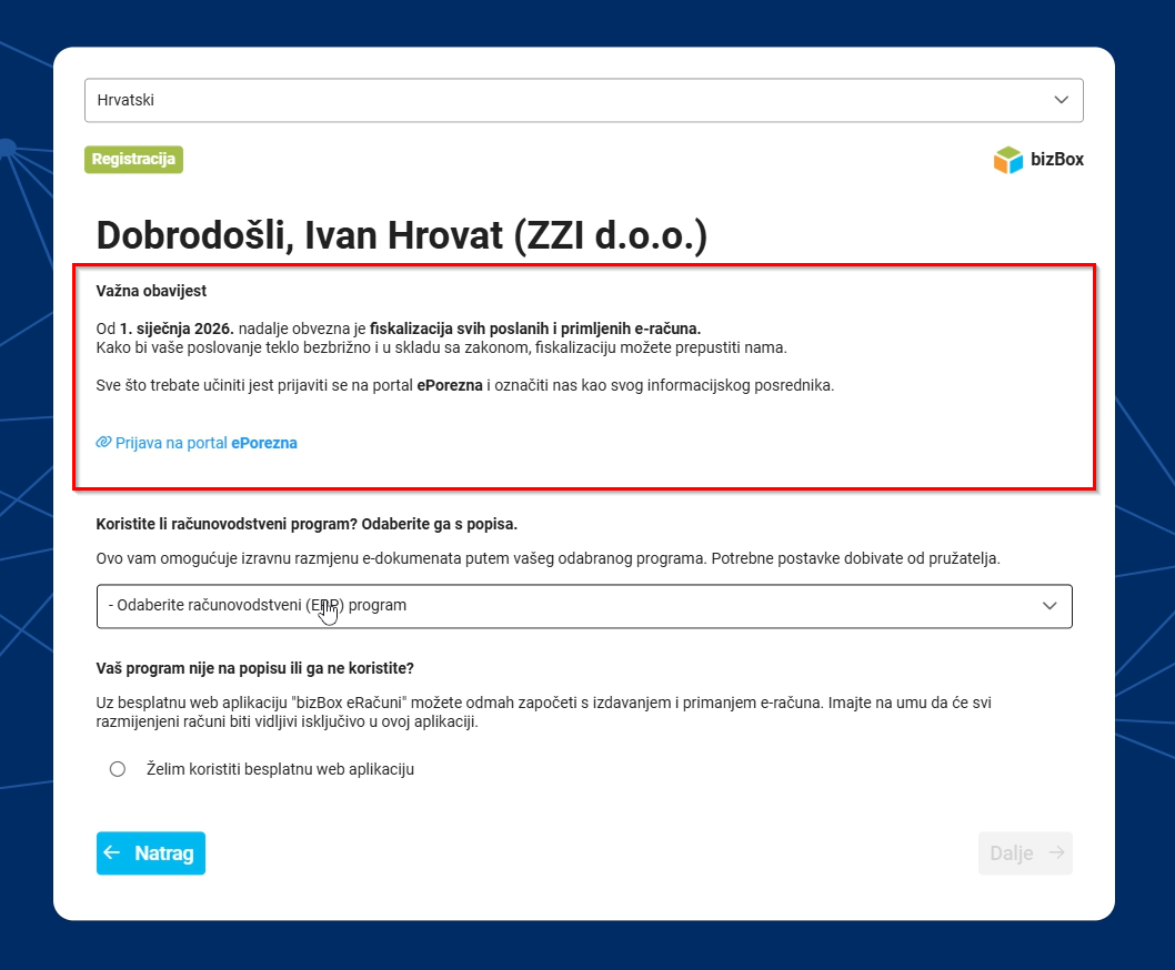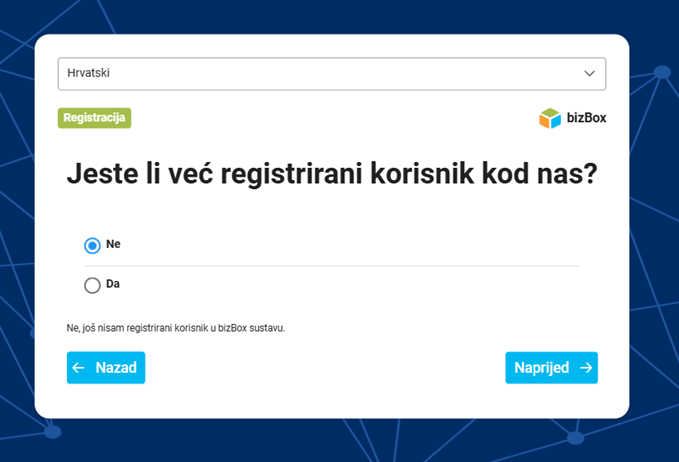 Ako odaberete Ne, odnosno da niste korisnik bizBoxa, slijedite sljedeće korake.