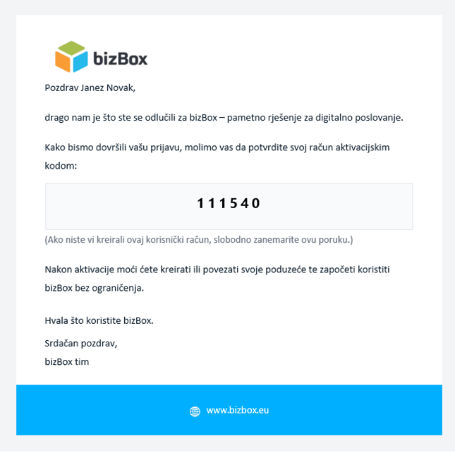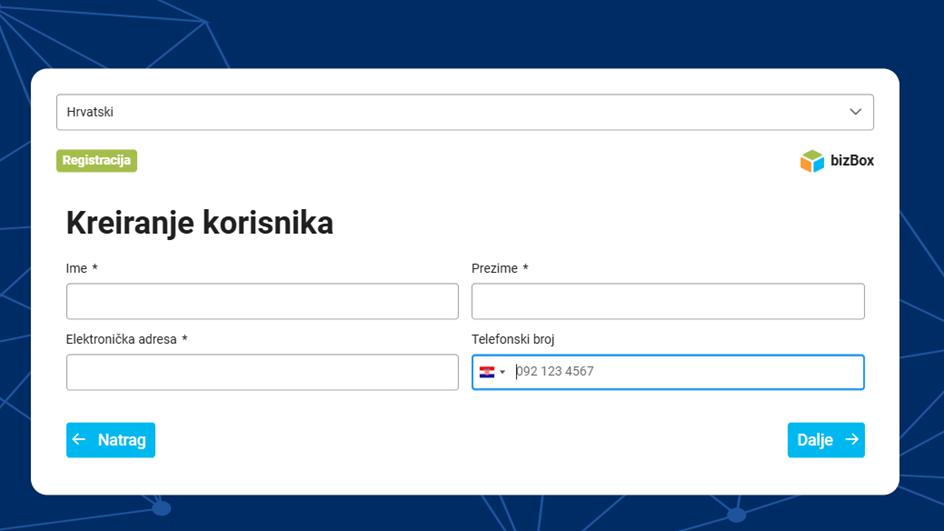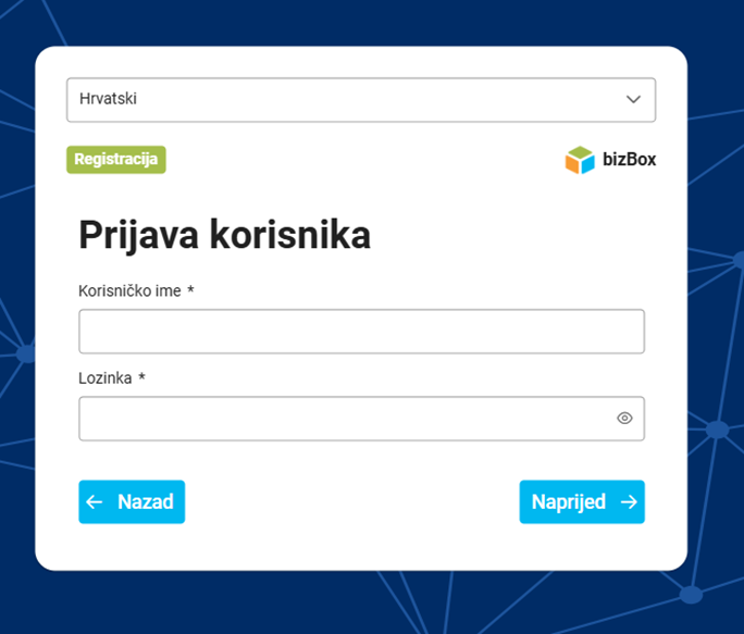Otvorite poveznicu za registraciju novog korisnika: bizBox registracija novog korisnika.