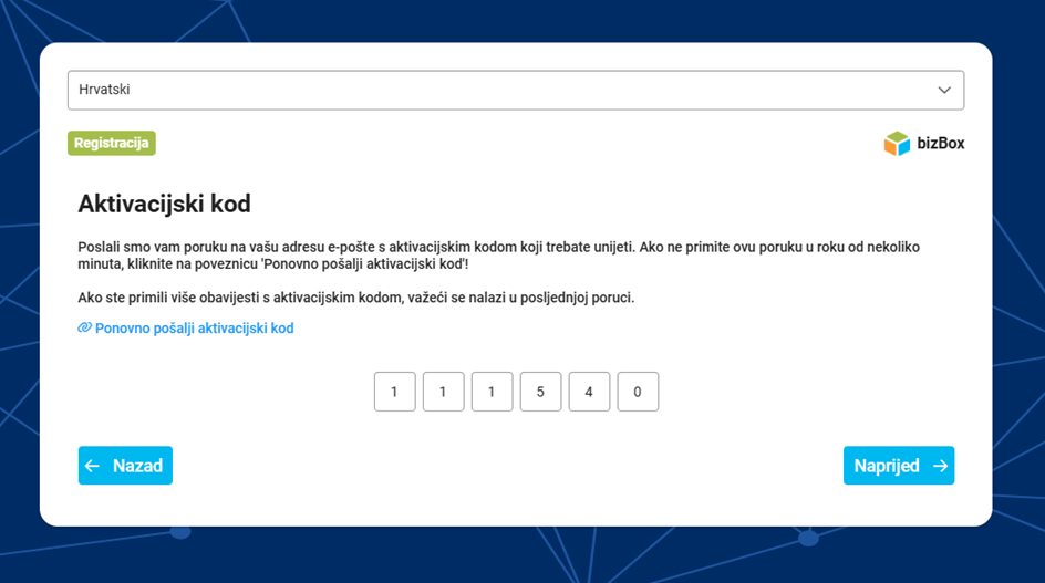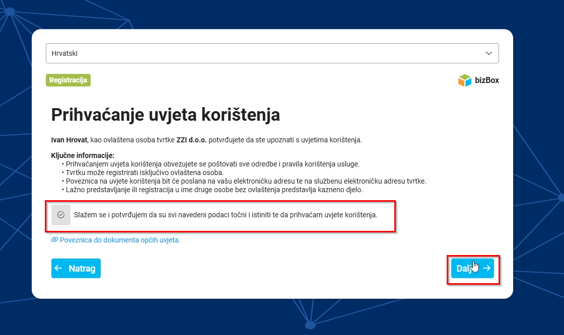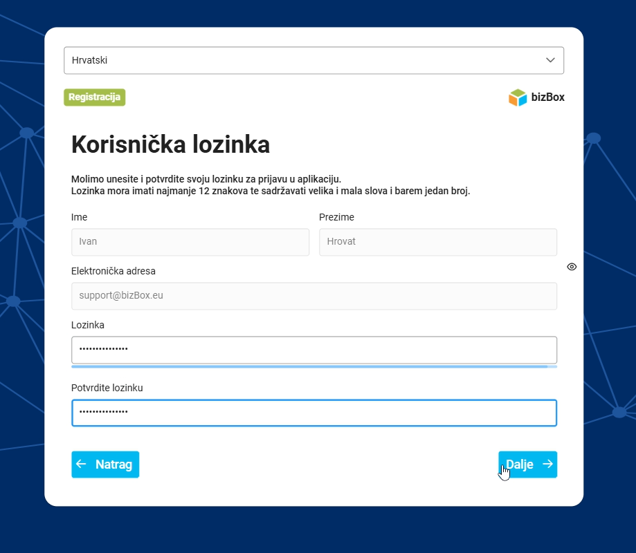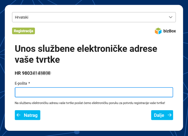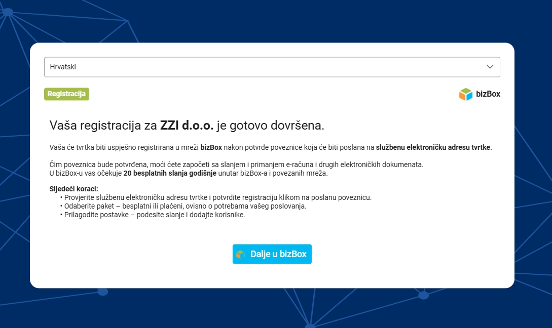 Registracija je gotovo završena. Na službenu e-mail adresu tvrtke poslana je potvrdna poveznica. Kliknite Dalje u bizBox.
