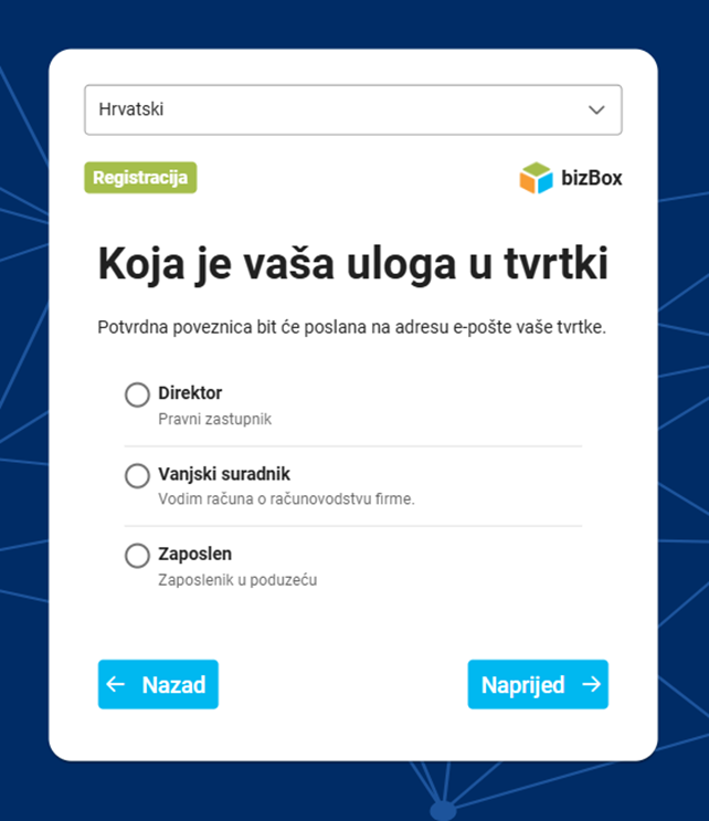 Odaberite jednu od mogućnosti: Direktor, Vanjski suradnik ili Zaposlenik. Odabir uloge može utjecati na prikaz u samom portalu, dok funkcionalnost ostaje ista. Zatim kliknite Naprijed.