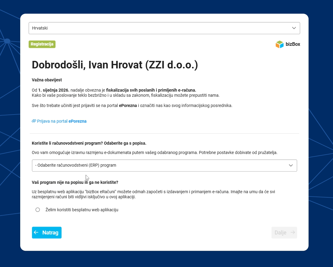 U ovim uputama vodit ćemo vas kroz osnovne korake registracije. Ako koristite računovodstveni ili informacijski sustav (ERP), tijekom postupka moći ćete odabrati ERP putem kojeg će se razmjenjivati dokumenti.