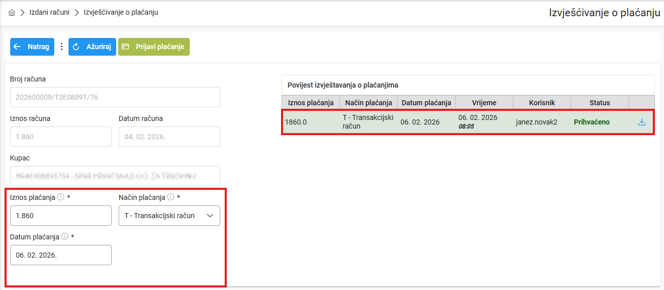 - Ako je prijavljeni iznos jednak iznosu računa, status računa se automatski mijenja u Plaćen
